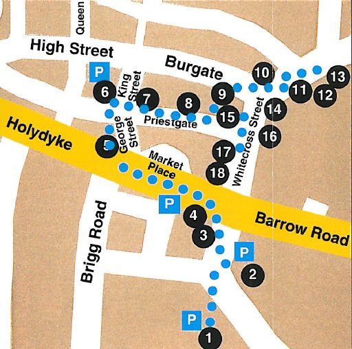At the north end of St. Mary’s Lane is the magnificent medieval church of the same name. The view left along Burgate shows the imposing three-storeyed range built by William Mackrill in 1806. The Mackrill family owned one of the earliest brickyards as well as boats in which the bricks and tiles were shipped away to builders in the Humber basin and as far away as East Anglia and London.